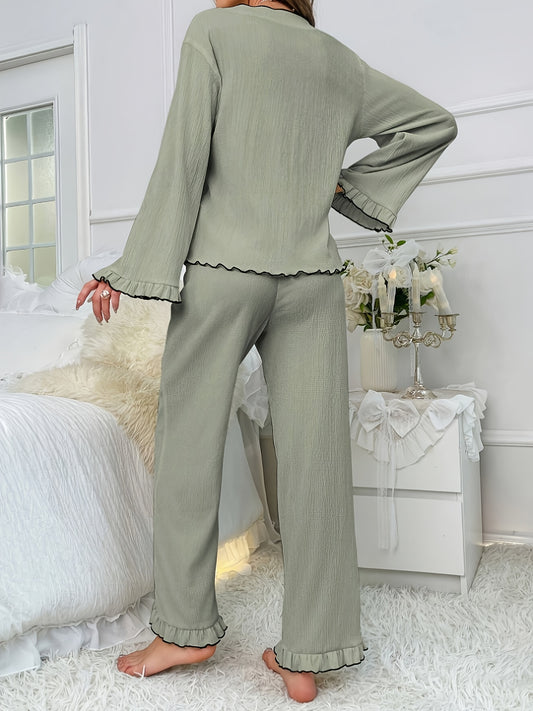 Tvådelad pyjamas med V-hals i mjuk polyesterblandning – långärmad topp & byxor